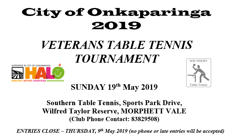 Southern Table Tennis invites veteran players (over 30) to participate in the City of Onkaparinga Veterans Tournament on Sunday, 19 May 2019. Entries close on Thursday, 9th May. Southern Table Tennis acknowledges event sponsor the City of Onkaparinga which makes it possible for competitors to receive free bottled water, fruit and tea & coffee on the day. The appended entry form is a smart pdf, open it in Adobe Acrobat Reader to access full features of lodging the form.